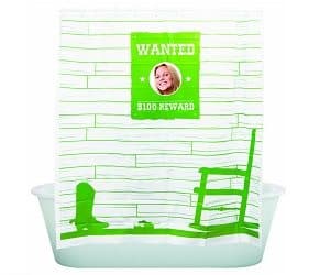 Turn your bathroom into a scene from the Wild West with this 'wanted' shower curtain! Peep through the window and you've put yourself onto your very own 'wanted' poster! Available in green and brown.