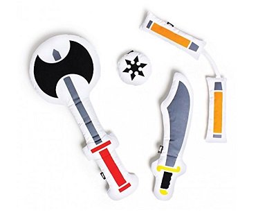 Take your game of pillow fight to new heights with these fun to use weapon cushions! Includes a double-sided Viking axe, nunchucks, a sword and a ninja star. Great fun for sleepovers! What will be your weapon of choice?