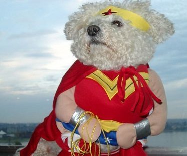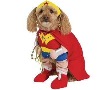 Get your pooch involved in the fancy dress or Halloween party with this hilarious Wonder Woman pet costume! It features a jumpsuit with attached arms to make your dog look like a miniature person! There's also an attached cape and a headpiece.