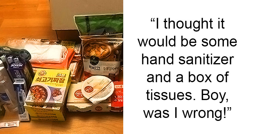 “Currently in Korea and had some limited contact with a confirmed case. I was immediately notified by my local government office and tested the next day. Thank God it came back negative, but they still advised that I self-quarantine for 14 days. I got a call from a dedicated case officer that will check in on me twice a day every day during my quarantine. Mentioned they would drop off some supplies later that day which I thought would be some hand sanitizer and a box of tissues. Boy, was I wrong!”