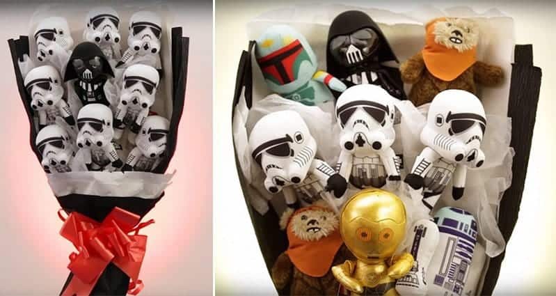 Valentine’s Day isn’t too far off and if you are tired of the whole flowers and chocolates tradition, we might have an alternative! If your other half is a ‘Star Wars’ fan and maybe a bit nerdy, ‘Think Geek’ has the perfect lovey-dovey gift! These awesome ‘Star Wars’ bouquets come complete with their own cute, little plushies which can be taken off of their dowels and played with at will. This bouquet won’t die after a week and is definitely unique! Take a look and see what you think below!