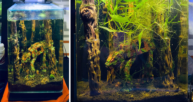 Three months after she posted the first photo of the now-viral Star Wars-themed fish tank, she shared an updated photo of the aquarium, this time with a very dense foliage. And there standing on the aquarium seabed is the solitary AT-AT walker covered in moss.