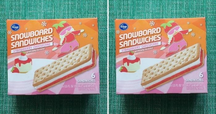 The Strawberry Cheesecake Snowboard Sandwiches appears to be the latest addition to Kroger’s frozen aisle this summer. And it’s so new that people are only beginning to discover this berry-licious treat! This treat joins Kroger’s range of other Snowboard Sandwiches that include vanilla, chocolate chip and Neapolitan. The box features the range’s trademark snowboarding scene, but this time, the background is pink. There’s also a small image of a strawberry cheesecake behind the snowboarder, in case its pink motif isn’t enough to suggest its flavor.