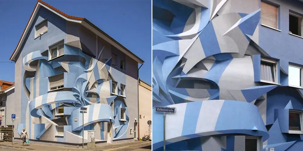 Peeta previously used airbrush to paint on walls. But he decided to permanently substitute it with acrylic paint, brushes, and rolls. Depending on the scale of the façade, it usually takes him 15-20 days to complete a large scale mural project. Over the years, he has transformed several buildings into incredible three-dimensional art pieces. His latest creation is this abstract mural on a building in Mannheim, Germany featuring tones of blue, white and gray.