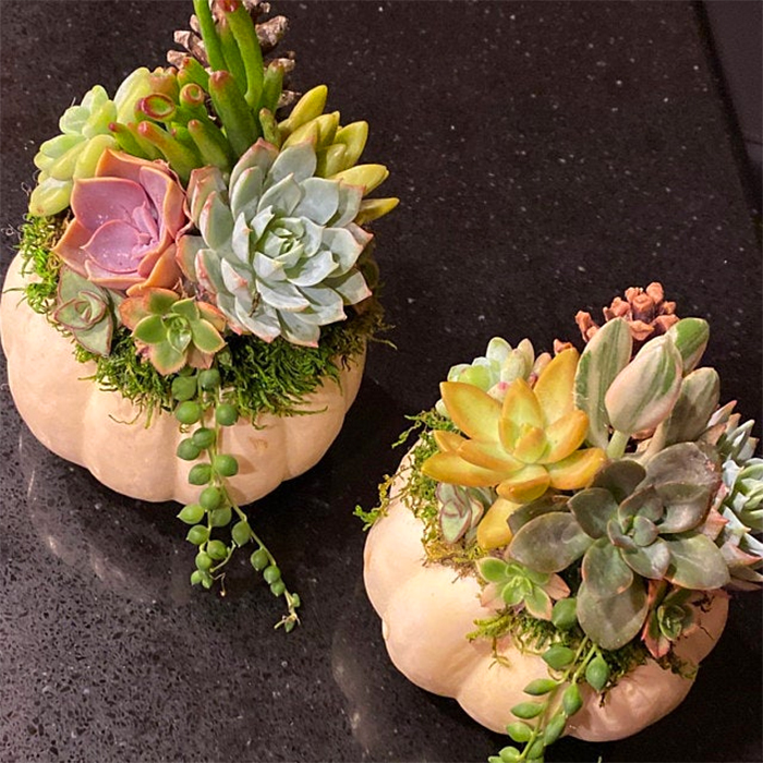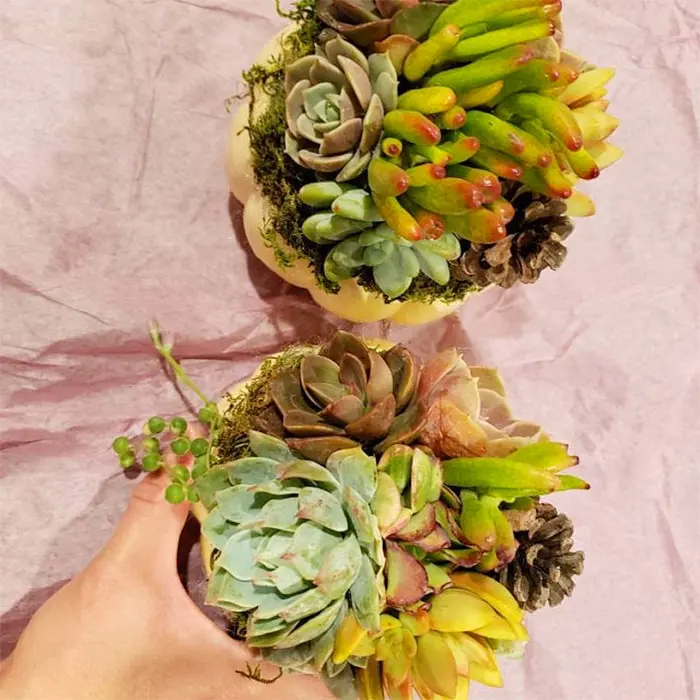 Each white pumpkin is about 4 – 5 inches wide with live succulent plants and moss planted on top of it. You can keep the succulent plants hydrated by spritzing the moss using a spray bottle once a week. These succulent pumpkins should last for weeks. Once the pumpkin has gone bad, you can simply remove the succulent plants and transfer them into cactus soil.