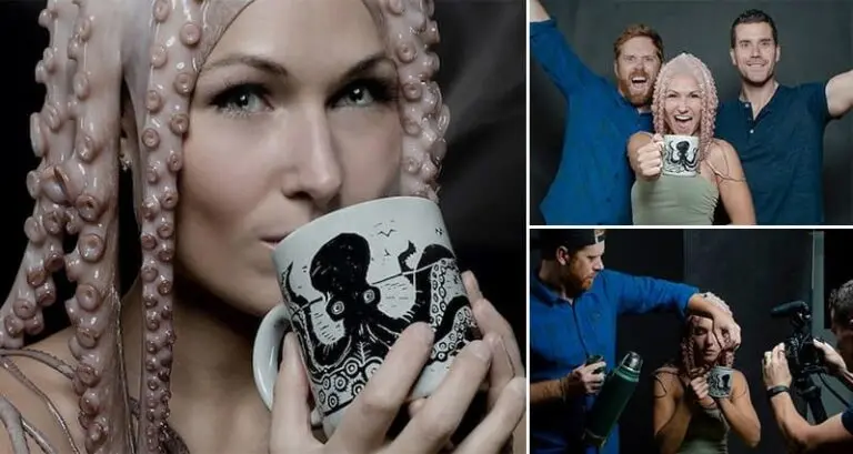 Would you pose with a real (dead!) octopus on your head, for love? Well, this lady would. In fact, she did, and you can see the rather freaky results in the images below! The woman is the fiancee of a guy called Joe Hodnicki, who's the creator of a prototype oceanic-themed drinking mug called, 'The Kraken Mug'. Hodnicki, who explains on his website, has always loved the ocean, as well as art and design. He is currently raising funds for his mug project on Kickstarter. What do you think? Take a look!