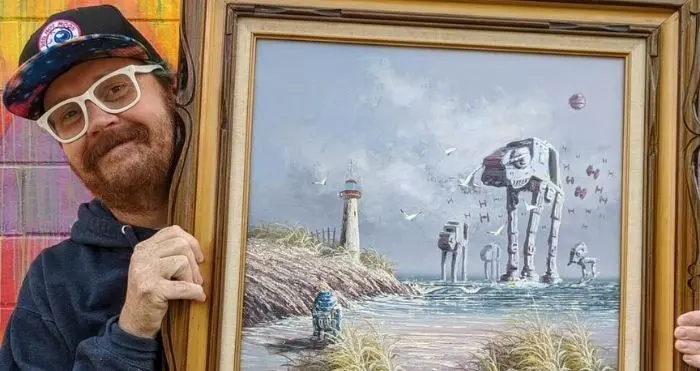 Sherrill currently has over 40 altered paintings listed on his vintage store’s website which he co-manages with his wife. Although his works feature a variety of characters, it’s pretty evident that the one franchise is his favorite. Many of his pieces portray a seemingly dystopian setting where the characters in the epic saga such as Yoda have made their way to the human world.