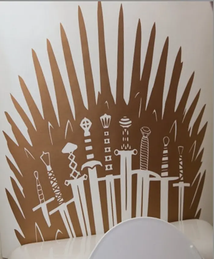 Etsy seller WordFactoryDesign offers self-adhesive vinyl decal that you can stick on the wall. Although you can attach it to virtuanlly any smooth surface, we recommend sticking it on the wall behind the toilet. This will instantly transform your porcelain toilet into the most-coveted Iron Throne. The Iron Throne Decal is available in four different colors – black, copper metallic, silver metallic, and gold metallic. Each sticker measures 20 inches wide and 23 inches tall to conform to toilet standard size.