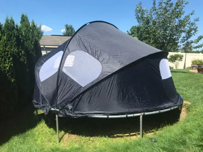This trampoline tent cover is compatible with 14-foot round trampolines. Although there are several types of trampoline covers out there, most of them just sit on top of the device. Unlike most trampoline covers, this trampoline tent cover has fastening straps that are tied around the trampoline’s perimeter to keep the tent in place. The trampoline sheet will act as the bouncy bed as the tent keeps you protected from mosquitoes and pesky insects.