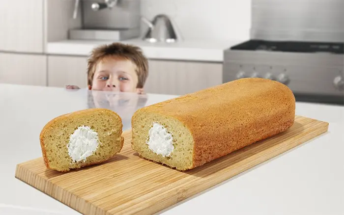 In a bowl, blend the cream filling mix and 24-oz heavy cream. Whisk vigorously for about 2 minutes then set it aside. Cut 4 squares on the bottom of the cake about 1 ½ inches deep. Remove the squares and trim off 1 inch from each, set aside. Fill the holes with the cream filling, place the cake squares back, and gently flip the cake back over onto plate. Then you’re ready to serve the largest Twinkie they’ve ever seen in their lives.