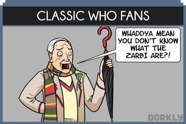 The BBC's 'Doctor Who' has captivated people since way back in 1963. Although specifically categorized in science fiction/fantasy genre, its unique storylines and fantastic cast appeal to a huge audience of all ages. Over the years, naturally the actor who portrays the Doctor himself has changed, which has divided fans on who the best is. Below are 12 amusing illustrations highlighting the different types of Doctor Who fans. So, take a look and see which you are best matched with!