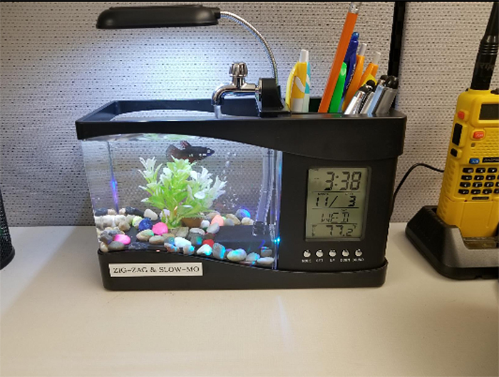 One of the most amazing things about this Mini Aquarium is that it can create pre-recorded nature sounds to help you relax. Simply press the Sound button below the screen and choose from a wide variety of sounds like flowing water, birds, frogs and many more. Take note that the tank motor and lights are powered by the USB cord (included). But the LCD screen and its accompanying functions are powered by 3 AA batteries (not included). There’s also a storage area on the top side of the unit to hold your office accessories, phones and more.