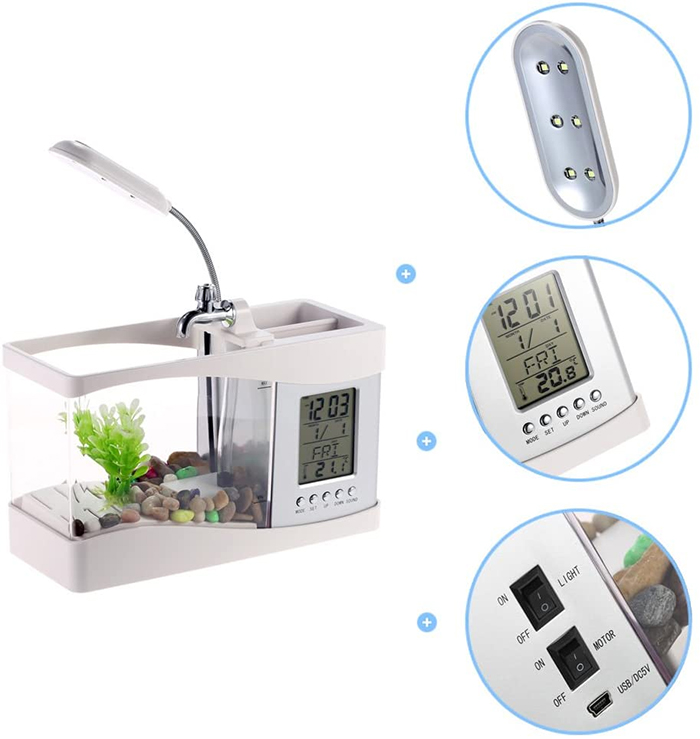 Simply plug this Mini Aquarium into a wall outlet or any USB hub on your desk. The switch buttons are located at the back of the unit. Just press the buttons to turn on the motor, the lamp and the LED light. This decorative fish tank also features a large LCD screen on the side that displays the time and calendar as well as the water temperature. You can set the temperature of the water and the time/calendar settings by using the buttons below the LCD screen. Furthermore, the screen is backlit so you easily view the display even at night.