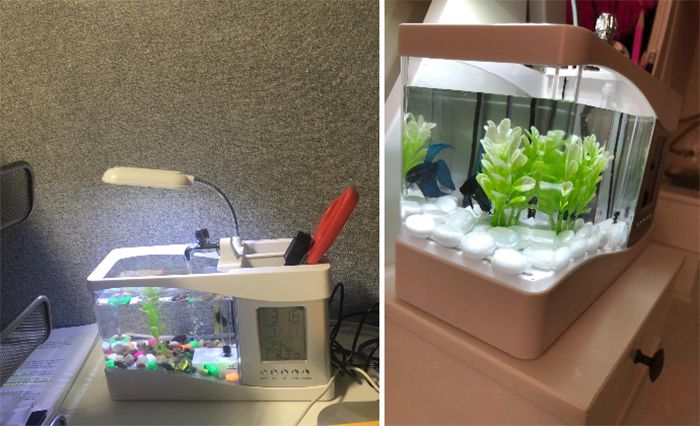 Overall, this USB Powered Mini Aquarium measures 9.4 inches long, 5.3 inches wide and 7.8 inches tall. The unit comes with decorative rocks and an artificial plant to get you started. You can add more ornaments into the tank if you prefer. Considering the size of the fish tank, we highly recommend placing small fishes such as bettas, guppies, neon tetras, zebrafishes or dwarf gouramis inside the tank. Also, we recommend cleaning the tank once a week to ensure the safety of your fishes. It is available in white and black color options. One happy buyer wrote: