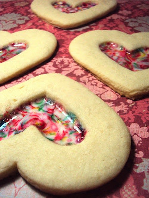 Make heart-shaped sugar cookies with gorgeous 'stained glass windows'. Instructions here.