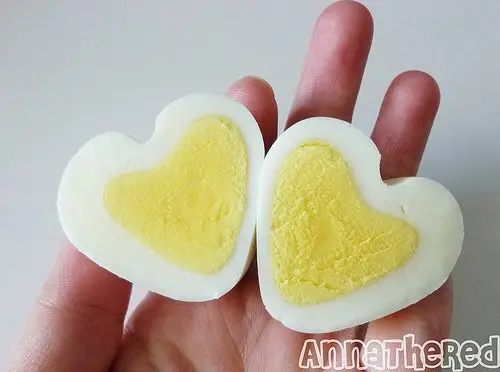 Manipulating a boiled egg into a heart shape is easy. You just need a milk or juice carton, a chopstick and rubber bands. Instructions here.
