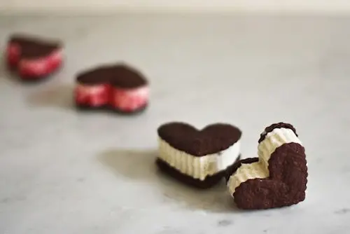 Mini ice-cream sandwich hearts with bittersweet chocolate cookie? Yes, please. Instructions here.