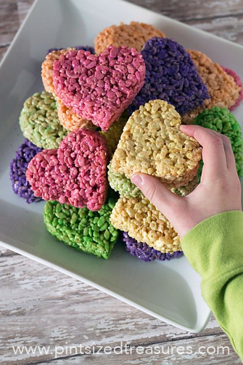 Heart-shaped, colorful rice krispie cakes are a fun way to say 'I love you'. Instructions here.