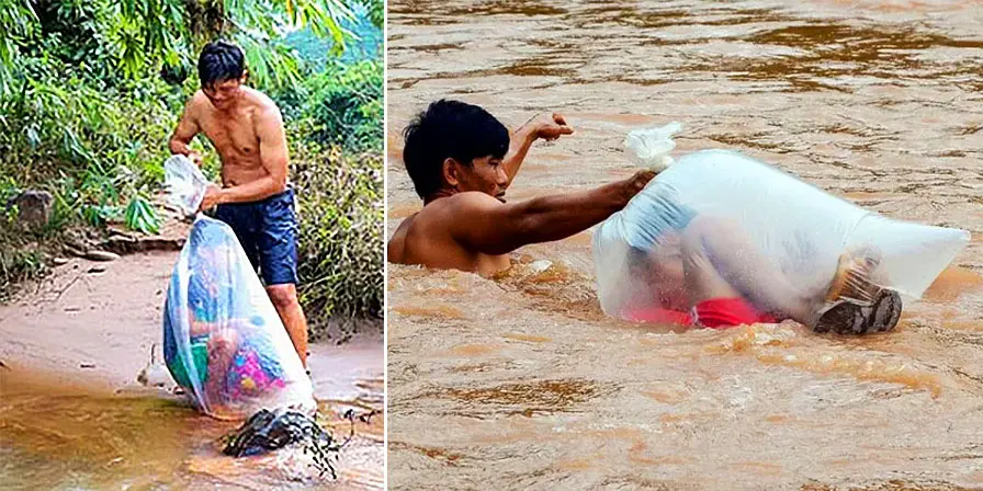 By placing the kids inside the plastic bags, each of them are dragged across the strong stream of floodwater by grown-ups. The parents understand the risk of this transport method. But both the parents and the children are willing to take the risk for the sake of education. For these people, access to education is the only route to escape poverty. So, they would go to extreme lengths just to attain the education they deserve.