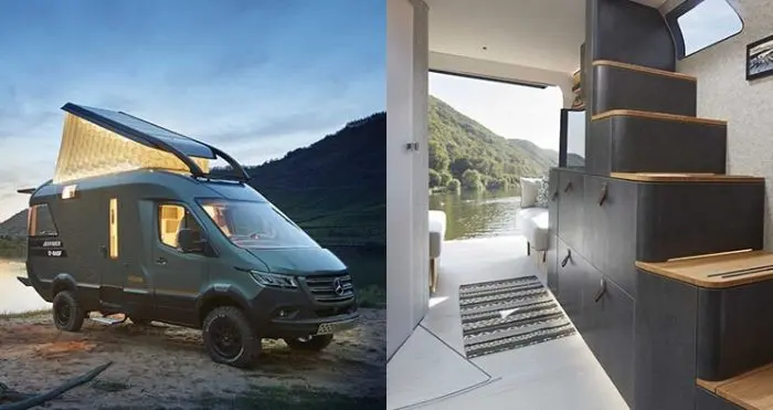 The VisionVenture Camper Van gives us a taste of what modern van life could be like in the year 2025. Built on a Mercedes Benz Sprinter chassis, VisionVenture features a futuristic design that maximizes the base van’s large interior. The interior can also extend to create a second floor. This houses the pneumatic pop-top roof that stores a bed large enough for two people. For safety and convenience, this camper also includes an actual staircase that doubles up as storage cabinets.