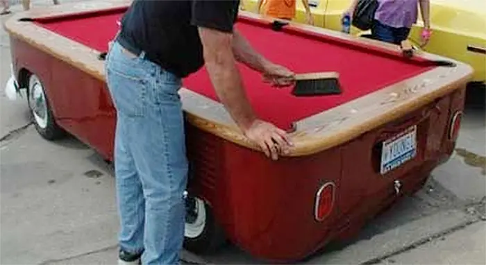 That’s exactly the case with the designer who created this VW Pool Table. For VW collectors, this is undoubtedly the most awesome billiard table they could ever have. This is an actual VW T1 hippy van converted into a billiard table. The VW Samba, the most luxurious version of the T1 known for its split windscreen, multiple windows and sunroof. Unfortunately, these remarkable features are not present in this VW-inspired billiard table because the hippy van was cut halfway down. As you can see, the flat top is then outfitted with a playable billiard table.