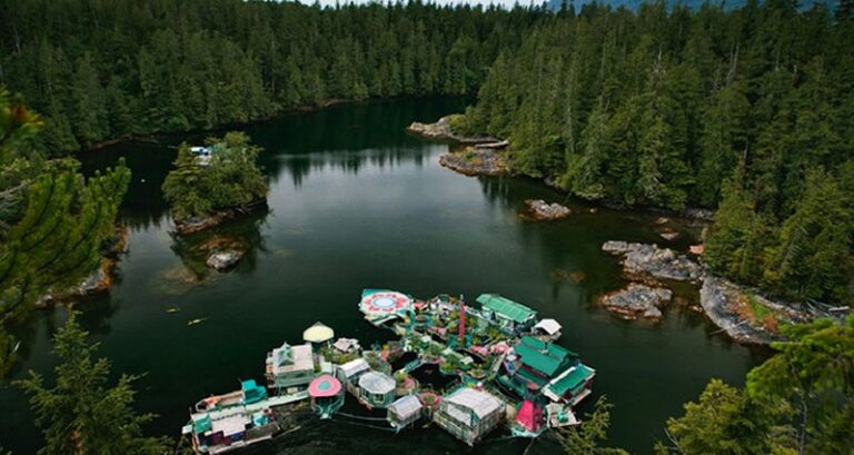 It’s not too unusual for people to decide to live off-grid, but the way that this couple have gone about it is definitely notable! Catherine King and Wayne Adams started building their own floating island back in 1992 and have been living a sustainable lifestyle, growing and fishing for all their food, since then. The island, which they have named “freedom cove” is located off the coast of Vancouver Island, British Columbia, and is made up of 12 floating platforms. Each platform have a different purpose; there’s a sleeping/living area for Catherine and Wayne, five greenhouses for growing food, a guest bedroom, and more. They even have their own art gallery and a dance floor! All their energy comes from a combination of photovoltaic energy generators and solar panels. Let’s check out this awesome residence!