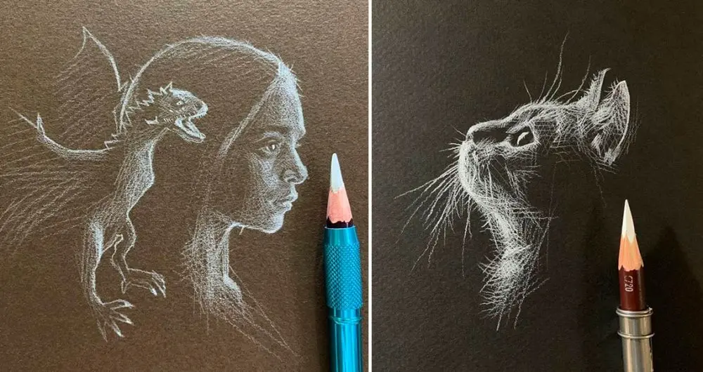 Minimalist, mysterious, marvelous – these are the words that best describe the artworks of Malaysian artist Kay Lee. In her series of striking illustrations, she uses a white pencil to capture light and expression on black paper. Her brilliant use of contrast and dramatic lighting allows her to use dark space to bring her minimalist drawings to life. The contrasting lines and backdrop give the drawing depth, emotion and mood, with a tranquil and mysterious ambiance.