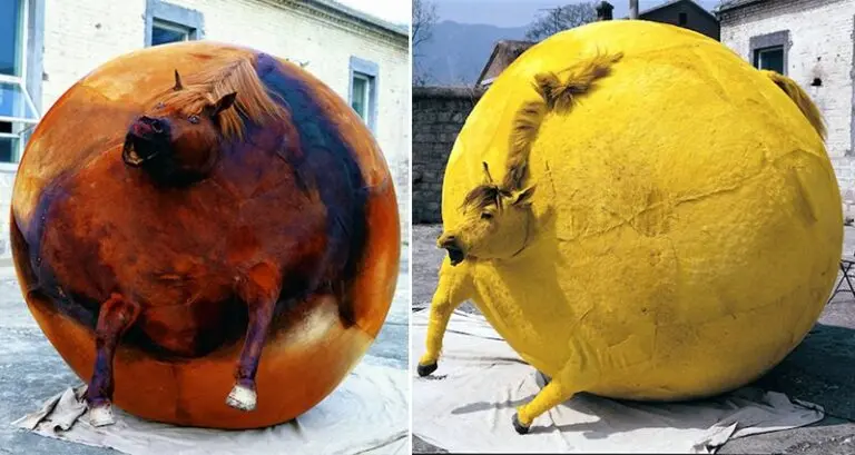 Chinese artist Yang Maoyuan's sculptures are like nothing you've ever seen. That's because they're made out of the skins of dead animals, which Maoyuan inflates massively, often dyeing the hides in lurid colors, too. First he stitches and processes the skins, then he blows them up to huge circular shapes, which are meant to represent harmony in China. Horses, goats and sheep are the artist's favorite mediums. In some of the sculptures Maoyuan gives the sheep or other animals two or three heads, making them even more creepy! Check out his work below!