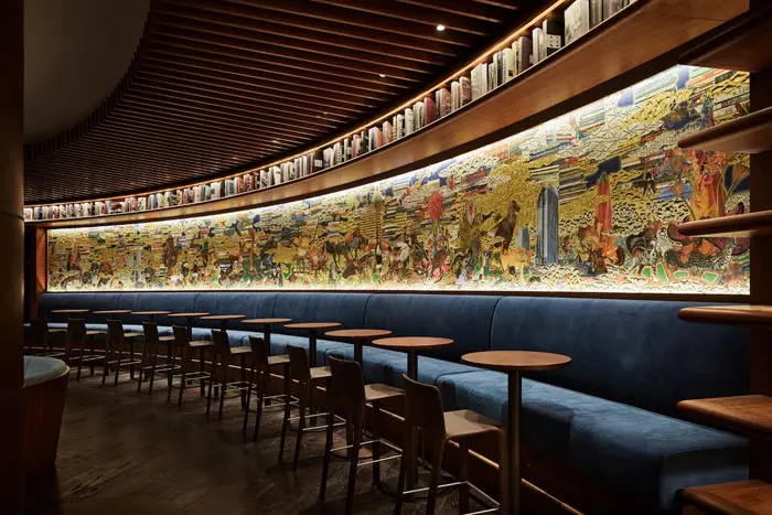 Apart from the spiral staircase, visitors can also access the second floor through the escalators. The second level of the YJY Maike Centre Flagship Bookstore functions as a lobby for the Grand Hyatt located on the upper floors of the commercial building. While the first floor features the functionality of a bookstore, the second floor evokes the atmosphere of a gallery. It has a coffee bar where visitors can mingle and exchange creative ideas. Moreover, the designer made use of rich wood tones and low ceilings to convey a congenial mood. But the second level isn’t just a cozy lobby. It also showcases a 165-foot-long “Book Street” that unites the concept to the bookstore below.
