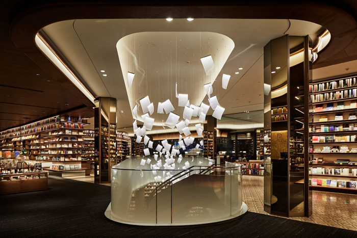 The YJY Maike Centre Flagship Bookstore occupies the first and second floors of a commercial complex. Each floor has an area of 4,500 square meters where Ikegai cleverly plays with the scale of the space. Inspired by Chinese and Japanese traditional palaces, the designer exceptionally intertwines classical and contemporary designs. Upon entering, a 33-foot-tall bookcase inside the entryway serves as a bold statement of what the building is all about. It leads to an open spiral staircase that connects the two levels. The first level is filled with bookshelves containing books from around the world. But the most captivating piece is the unusual chandelier above the spiral staircase that looks like sheets of paper floating in the air.