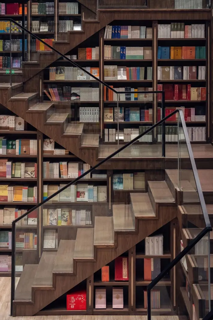 The staircases are made of wood to project a more solid visual effect. But the railings are purely made of glass in order to create visual flow and continuity. Although the staircases are designed in an orderly manner, the assortment of colors from the bookshelves adds chaos to enhance the illusion. Stepping inside the Zhongshuge Bookstore, you’ll certainly feel being sucked inside Escher’s masterpiece.